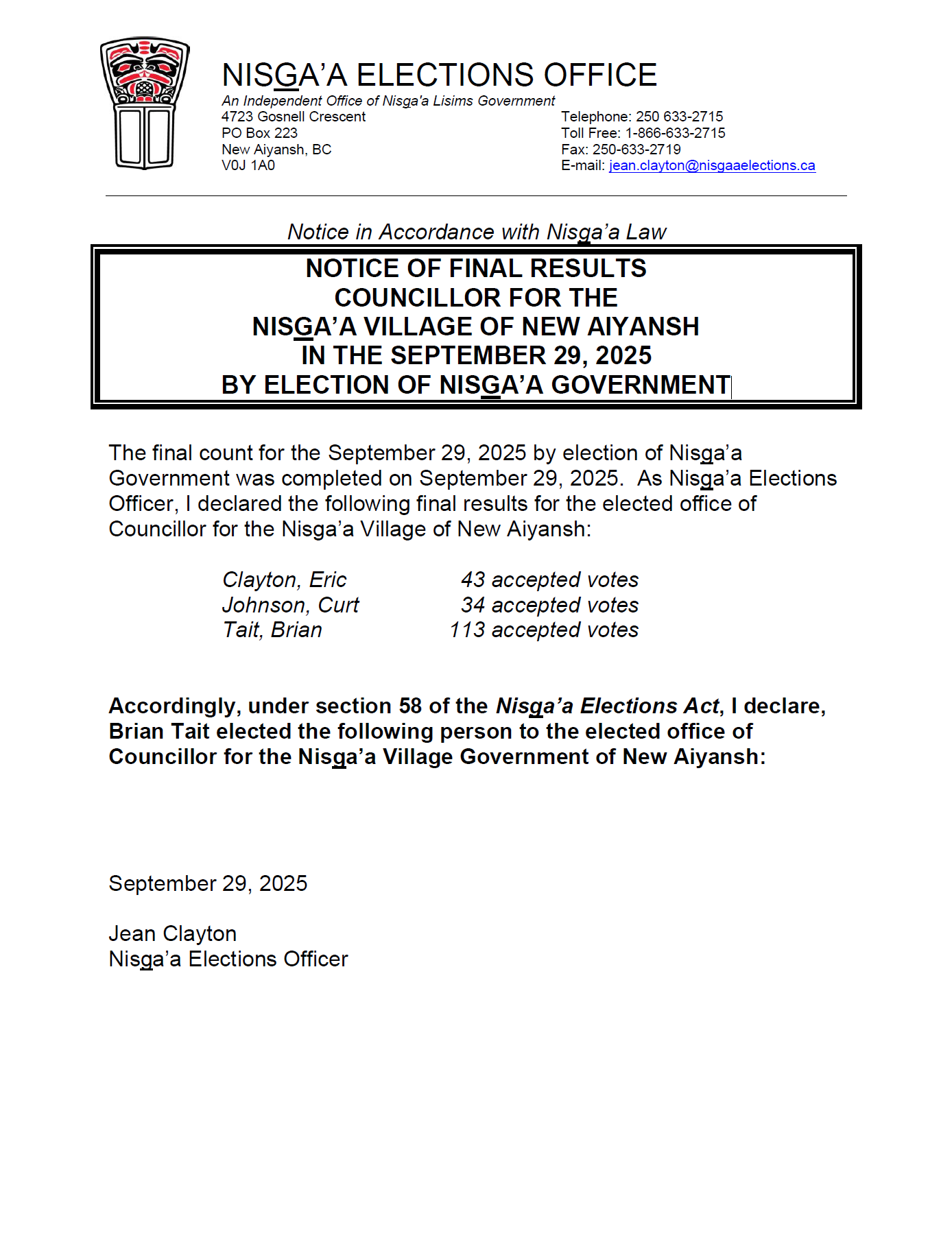Home News & Events News NOTICE OF FINAL RESULTSCOUNCILLOR FOR THENISGA’A VILLAGE OF NEW AIYANSHIN THE SEPTEMBER 29, 2025BY ELECTION OF NISGA’A GOVERNMENT